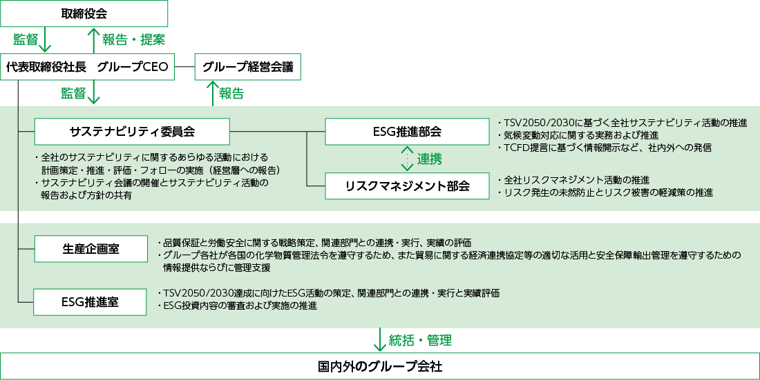 可持續(xù)發(fā)展委員會及其下屬的ESG推進委員會正在根據(jù)TCFD的建議推動應對氣候變化的措施和信息披露。此外,artience Co., Ltd.的生產(chǎn)企劃室和ESG推進室是專門的組織,對整個集團進行監(jiān)督和管理,并與相關(guān)部門合作推動舉措。