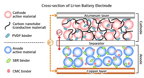 鋰電池的正極主要由活性物質(zhì)、導(dǎo)電劑、粘結(jié)劑構(gòu)成。導(dǎo)電劑的部分,將碳黑替換成碳納米管的話,少量添加就可以達(dá)到較高的導(dǎo)電性能。